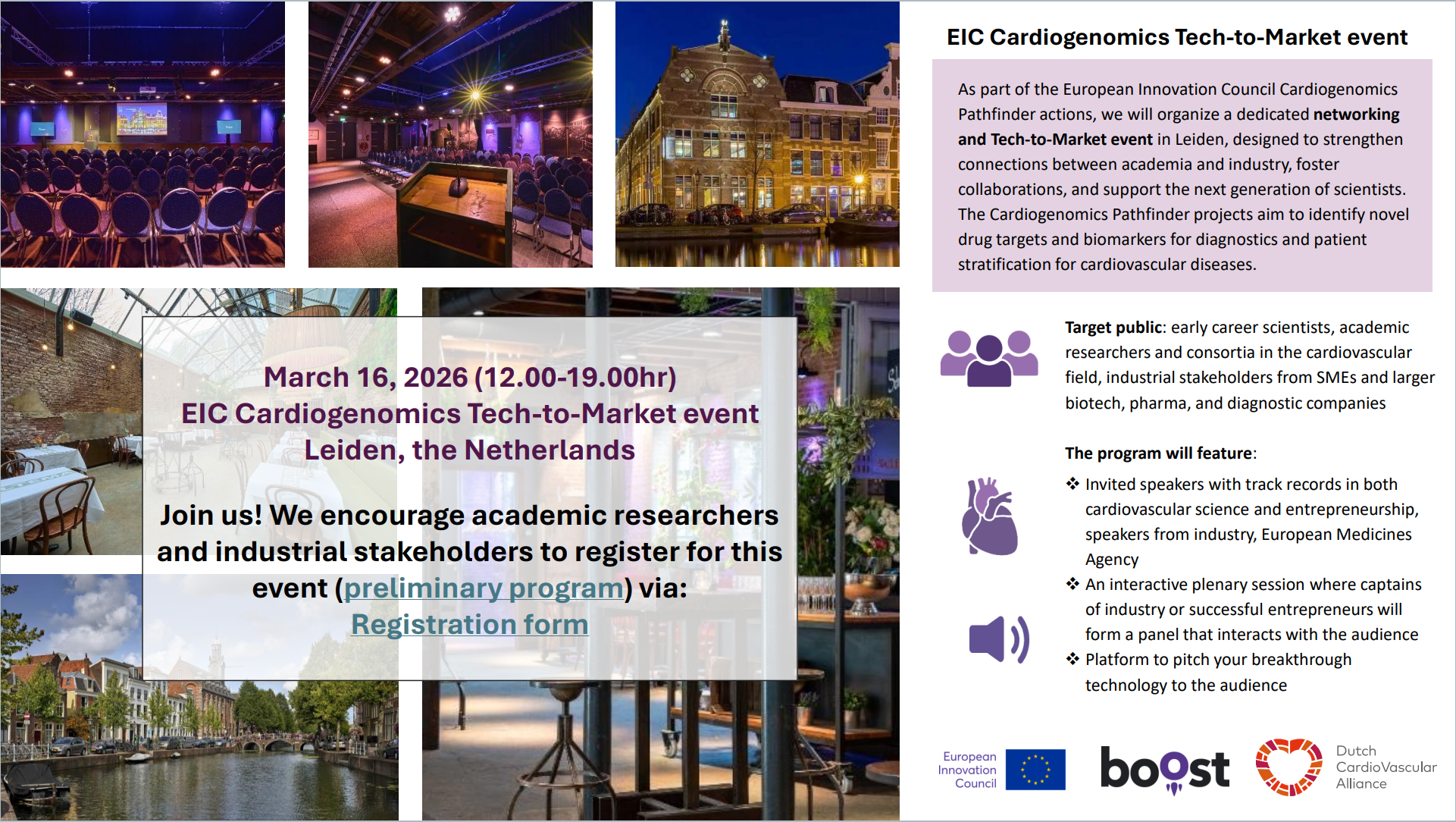 March 16 2026 we organise a private-public event as part of the European Innovation Council Cardiogenomics Pathfinder actions. This Tech-to-Market event is organised in Leiden (March 16 afternoon, 2026) at the Scheltemacomplex in the beautiful centre of the city at walking distance from the train station.